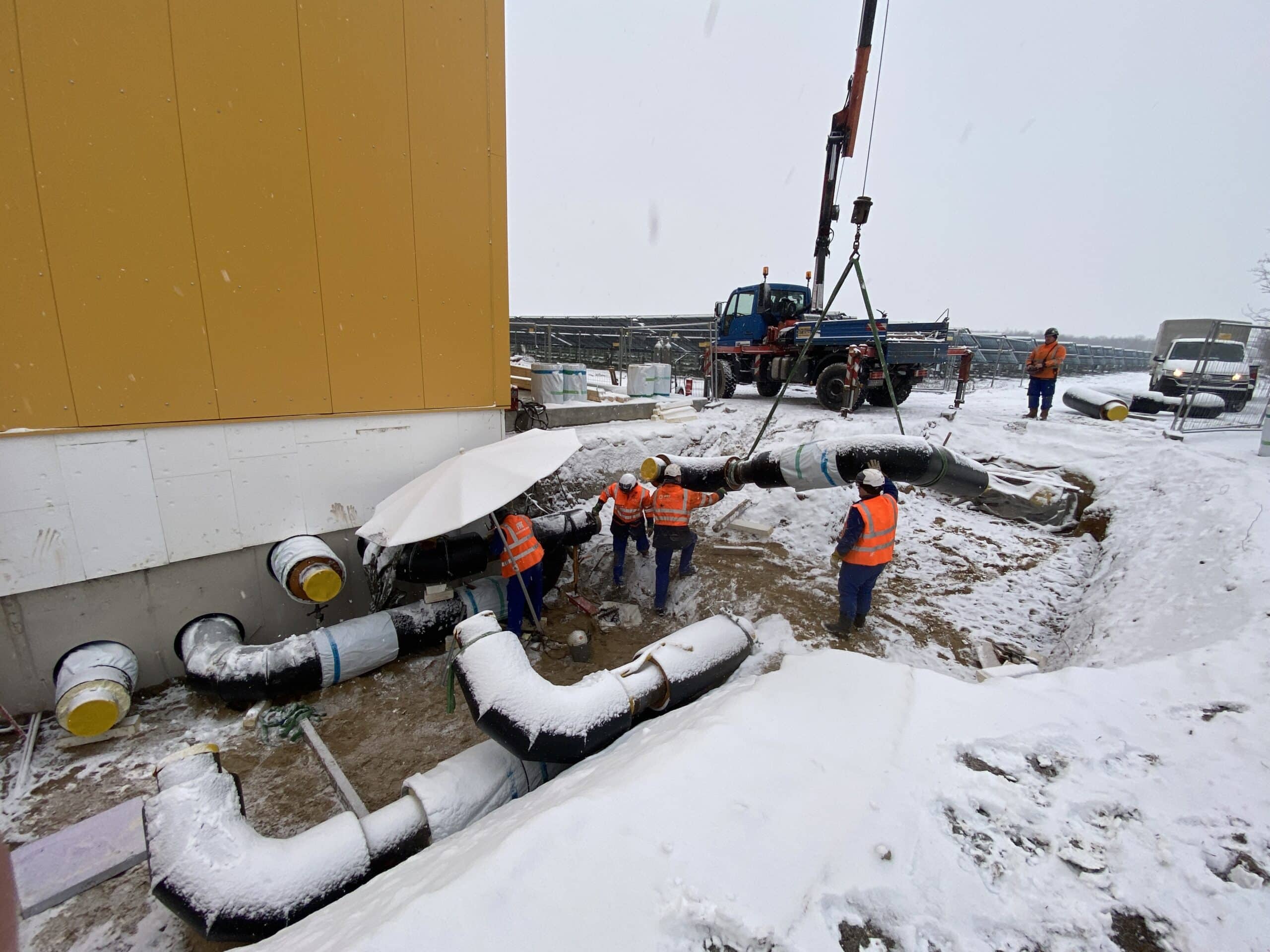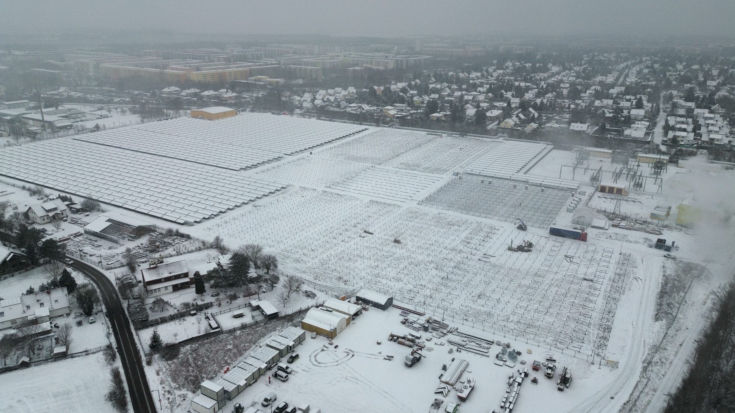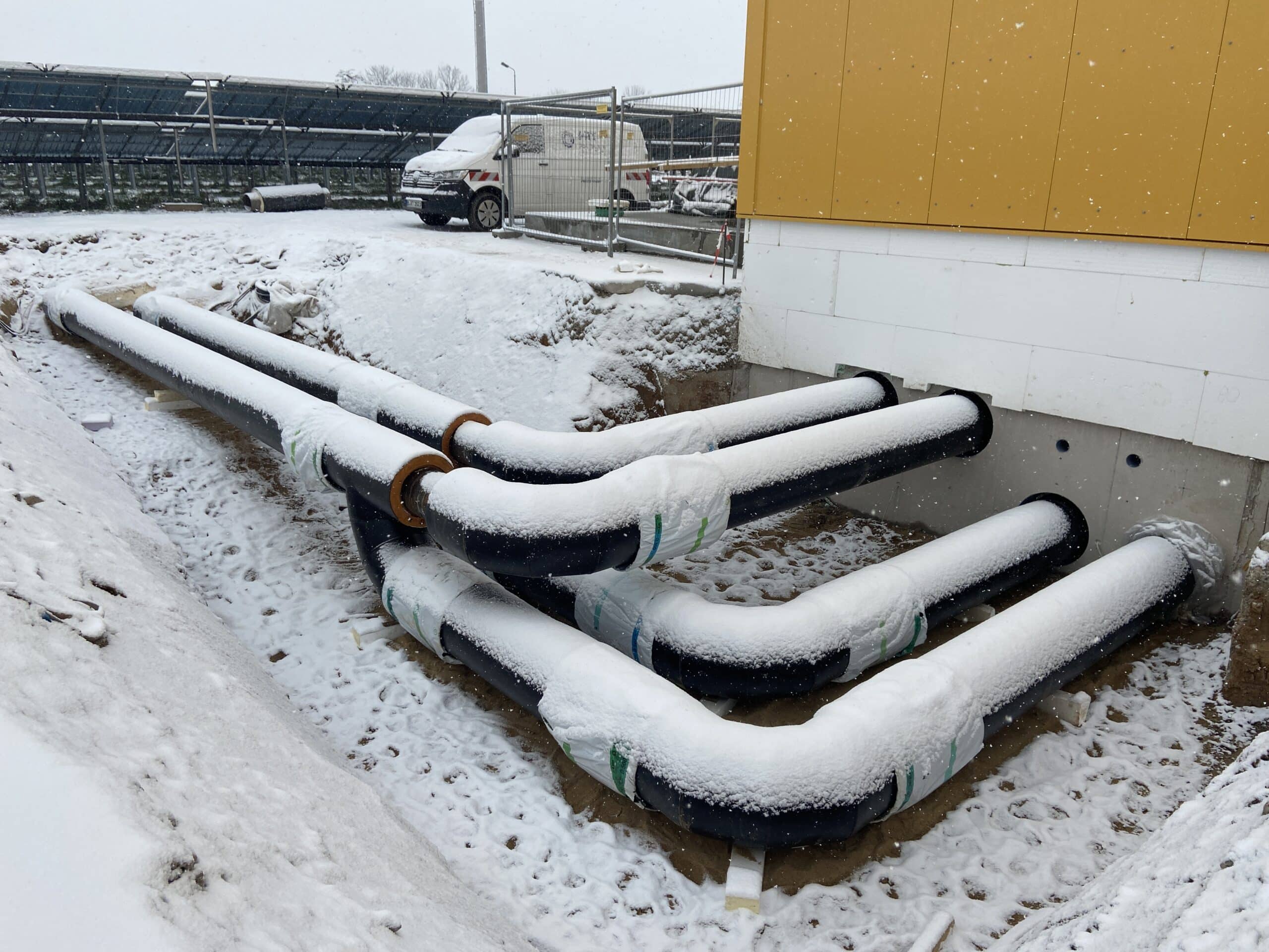 Die Baustelle der größten Solarthermie-Anlage Deutschlands in Leipzig zeigt sich derzeit in winterlicher Kulisse. Doch trotz Schnee und Kälte laufen die Bauarbeiten unvermindert weiter – und das nach Plan.